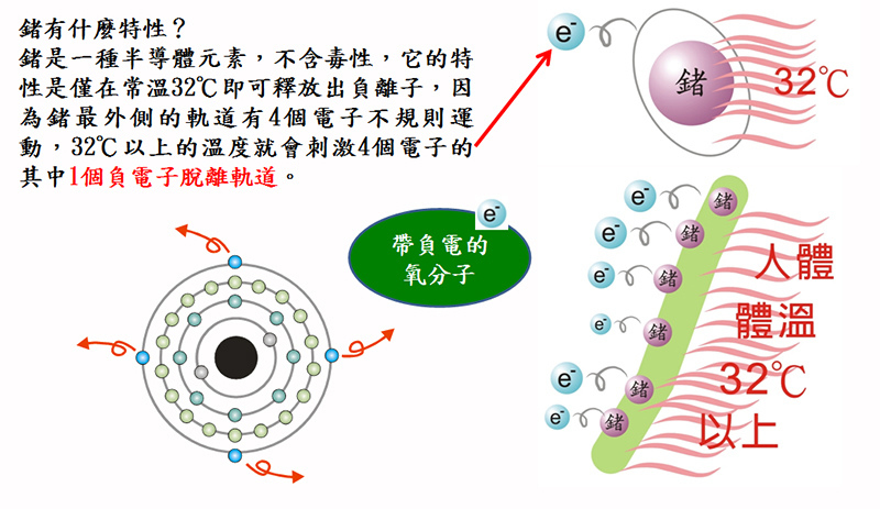 鍺在溫度32℃以上會自動釋放負離子及遠紅外線,遠紅外線可以促進人體的血液循環,也就是協助身體做運動,促使身體排汗,進而代謝出廢物及重金屬等對身體有害的物質。鍺能影響體內脫氫造氧運動,更能大量節省氧氣消耗,使身體升溫,促進血液與淋巴循環,同步排出乳酸等酸性物,淨化體質、消除痠痛、提升免疫力,促進體質酸鹼平衡。