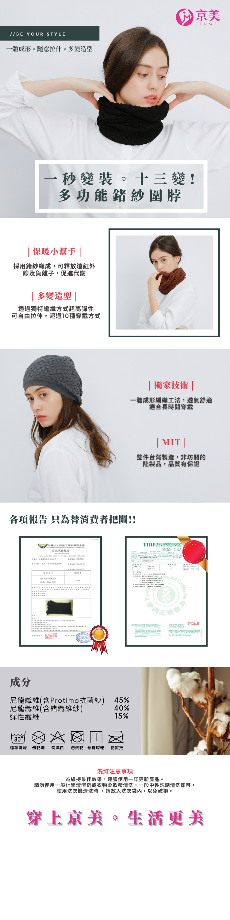 Made with germanium yarn, releases far infrared rays and negative ions to promote metabolism. Its unique knitting method provides ultra-high elasticity for free stretching, offering over 10 different ways to wear.