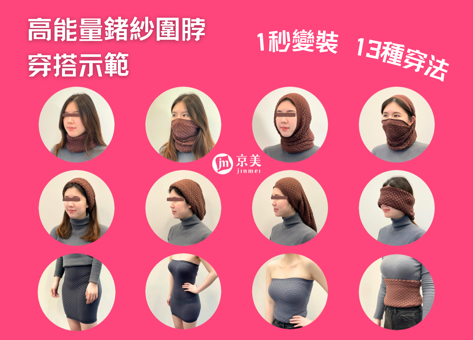 多功能圍脖為一盒2件,可選黑色/白色或咖啡色/灰藍色。採用鍺紗織成,可釋放遠紅線及負離子促進代謝,獨特編織超高彈性可自由拉伸,超過10種穿戴方式透氣舒適適合長時間穿戴。