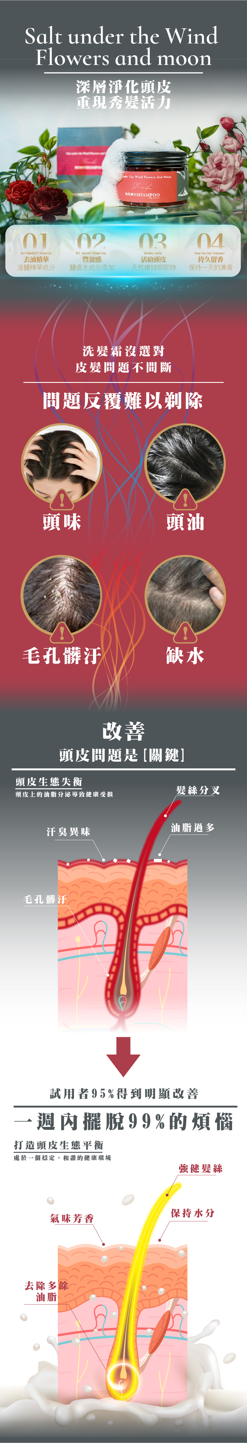 採用珍貴的澳洲鹽田天然海鹽顆粒,緊緻淨化毛孔,強化滋養髮根,維護頭皮健康