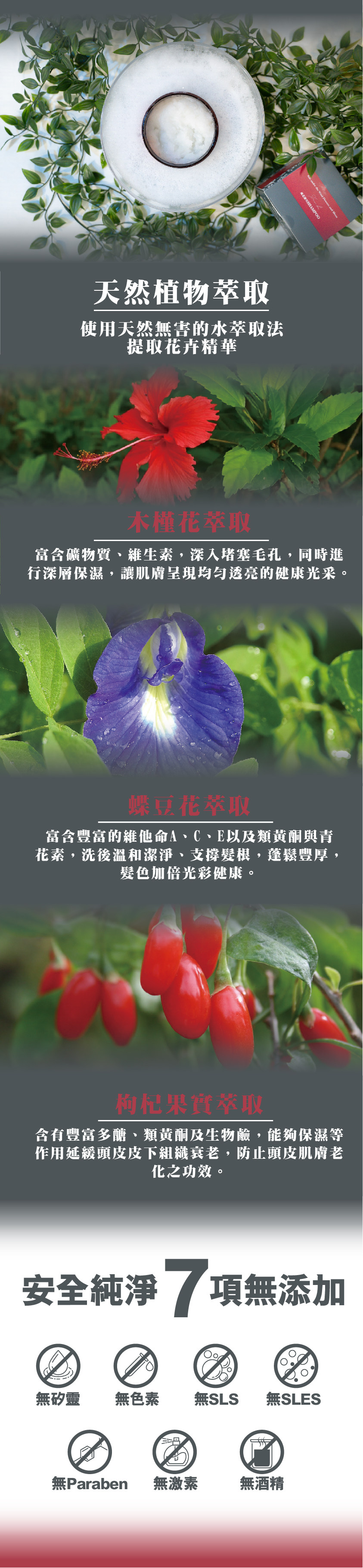 植淬三大配方:枸杞果實緊緻調理肌膚、滋潤頭皮,再搭配蝶豆花、木槿花調理肌膚油水平衡、平衡肌膚油脂分泌,讓我們活絡毛髮,整體呈現透亮光澤、讓我們毛髮看起來更蓬鬆,回復年輕光采,綻放青春的光澤。